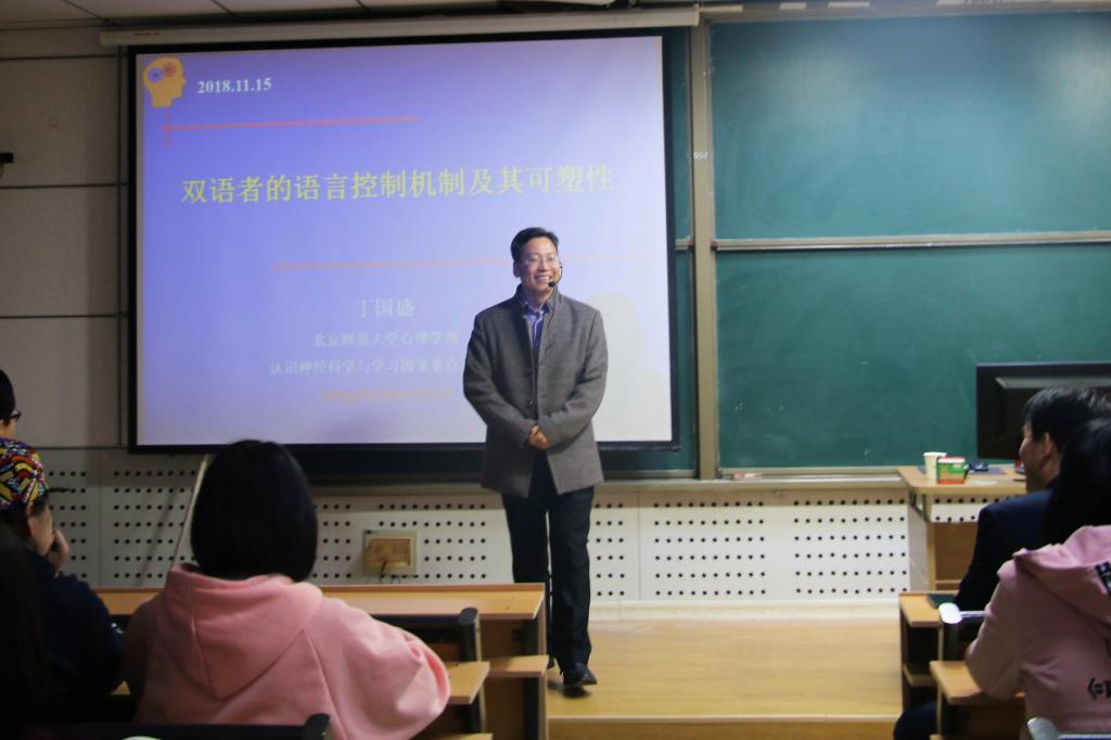 对丁国盛教授的到来表示欢迎,并就丁国盛教授的研究领域做了简要介绍。随后,丁国盛教授以双语现象为切入点,深入、系统地介绍了双语加工的脑机制研究,提出不同脑区担负不同的控制功能,并随情境发生变化,同时双语经验可以改变控制脑区的结构以及和语言脑区之间的功能连接。丁教授在报告后与学生积极互动交流,展开热烈讨论,认真专业地解答同学们的疑惑。