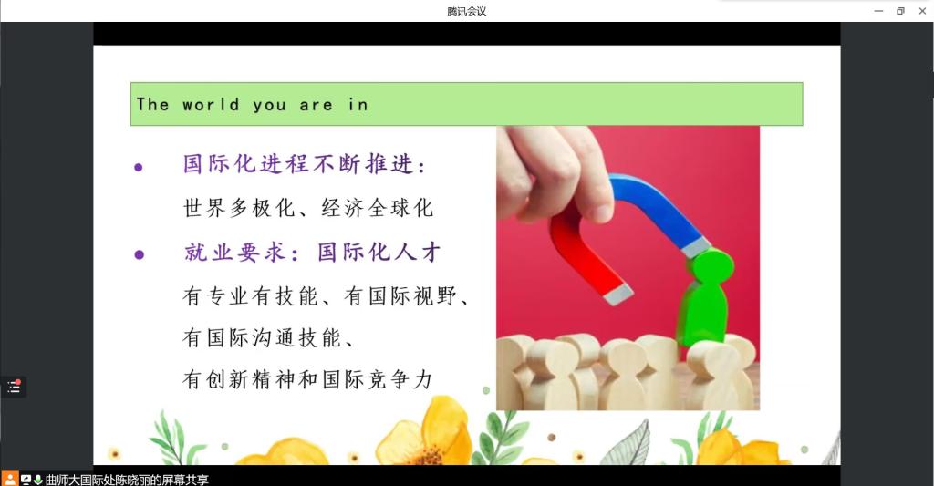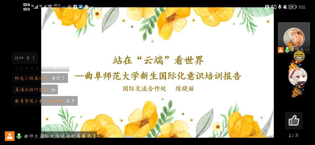组织2022级全体新生共同参加“站在‘云端’看世界”——曲阜师范大学新生国际化意识培训线上报告会,报告会由学校国际交流合作处陈晓丽老师主讲。