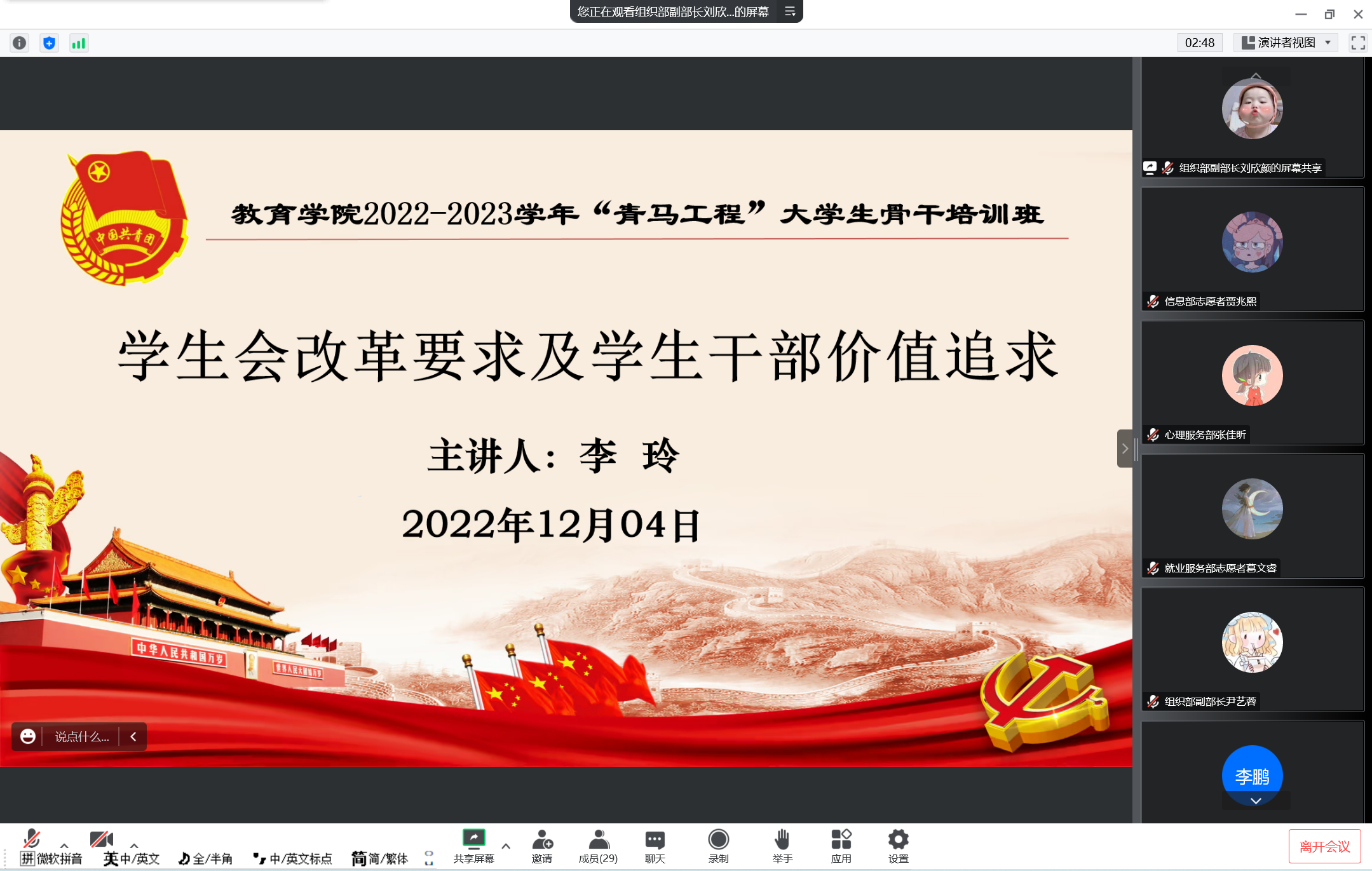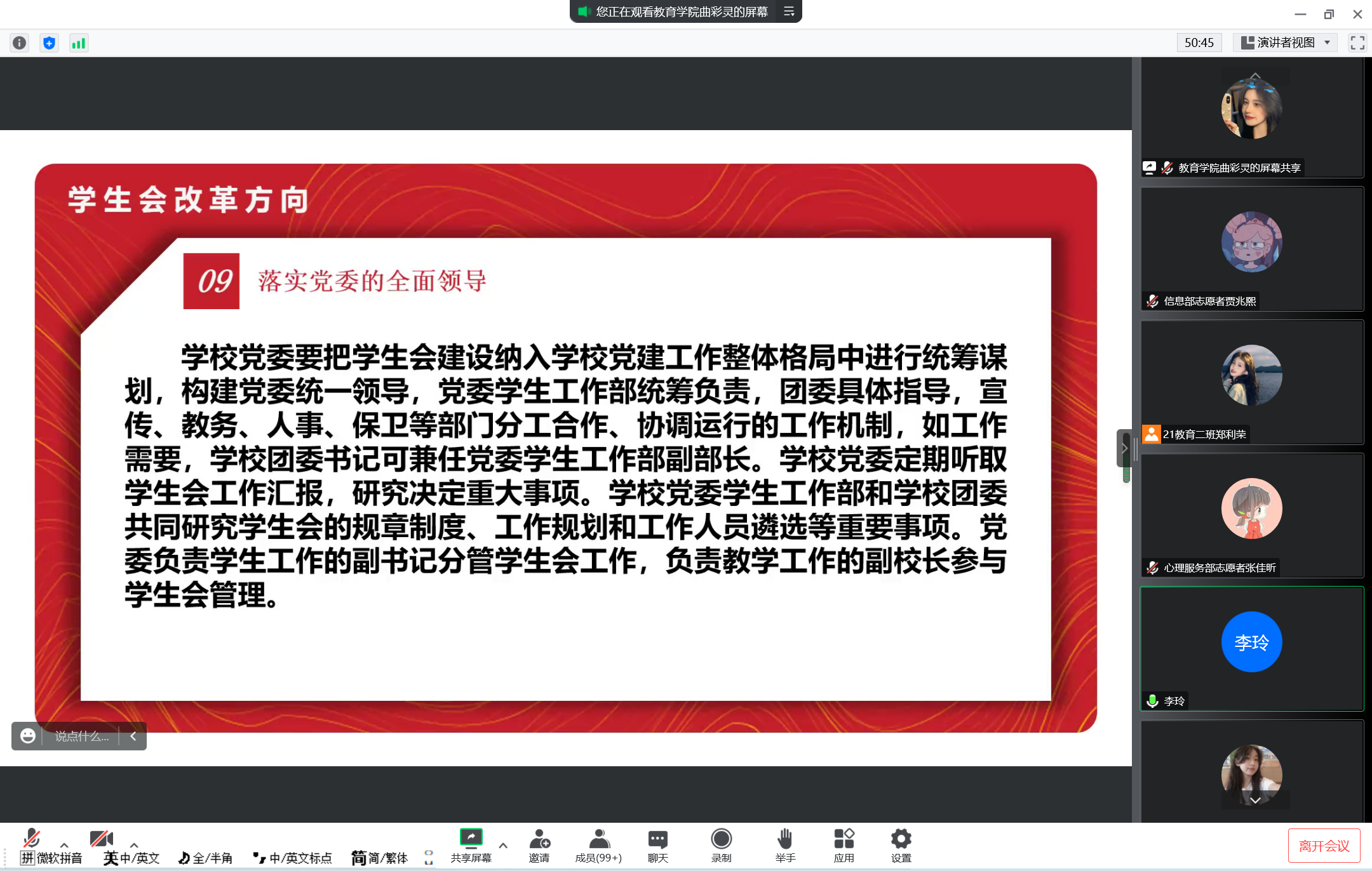 李玲以“学生会改革要求及学生干部价值追求”为题,从学生会改革方向以及学生骨干的自我定位两方面对学生干部进行思想教育。随后,她从明确职能定位、坚持精简原则、坚持从严治会等十个方向对学生会改革提出明确要求,并阐释了学生会改革的原因及其意义。同时,李玲老师也从恪守学生本分、牢记服务宗旨、永葆理想情怀三方面指导学生骨干明确自我定位,并希望一分快三