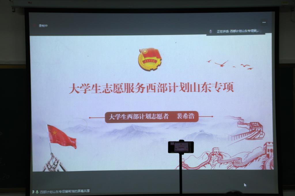 本次会议邀请到的往届西部计划志愿者向大家介绍了近年来曲阜师范大学大学生志愿者在支援西部工作中的相关情况,并结合自身经历就大学生西部计划志愿者选拔政策、网上报名流程、志愿者选拔标准等进行了宣讲和要点解读。他们鼓励同学们要积极响应团中央“到西部去、到基层去、到祖国和人民最需要的地方去"的伟大号召,报名参加大学生志愿者服务西部计划,带着“奉献、友爱、互助、进步”的志愿精神开启志愿征途,实现自己的人生价值和青春理想。