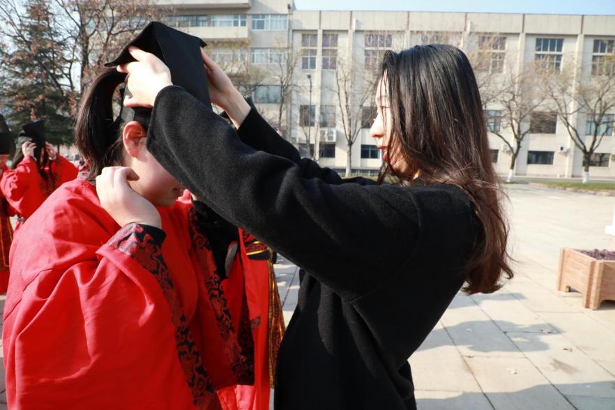 全体学子低头肃立,老师们为其加冠加笄,借古礼寄托对学子成年后的殷切期许。